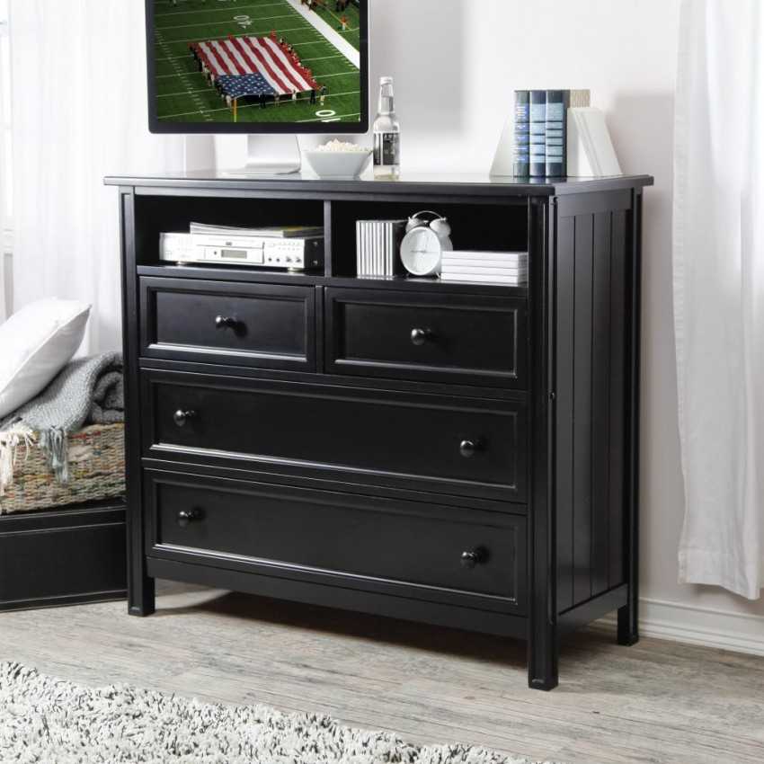 В гостиной комод станет не только местом для размещения одежды. Столешница может служить подставкой под видео или аудиоаппаратуру, а внутри его удобно разместятся фильмотека, альбомы, журналы и другие вещи, которым чаще всего не находится места, и они беспорядочно разложены по комнате. Поверхность модуля можно использовать для расстановки элементов декора, что добавит комнате уют и подчеркнет хороший вкус хозяев.