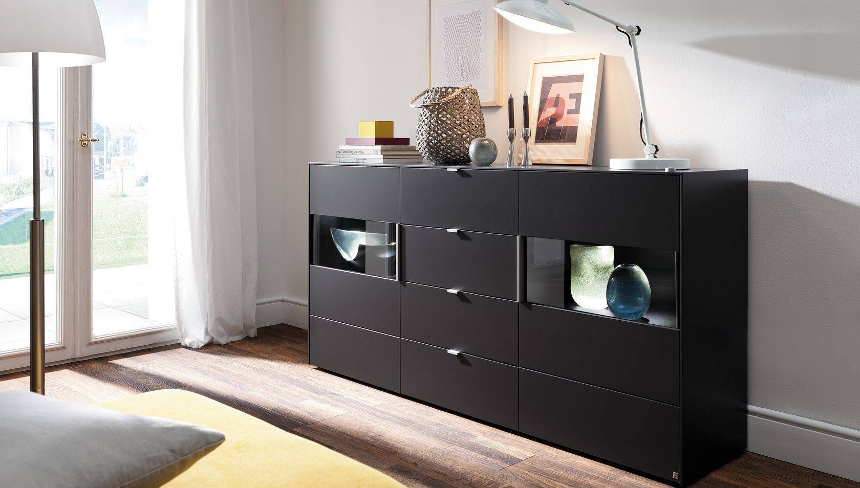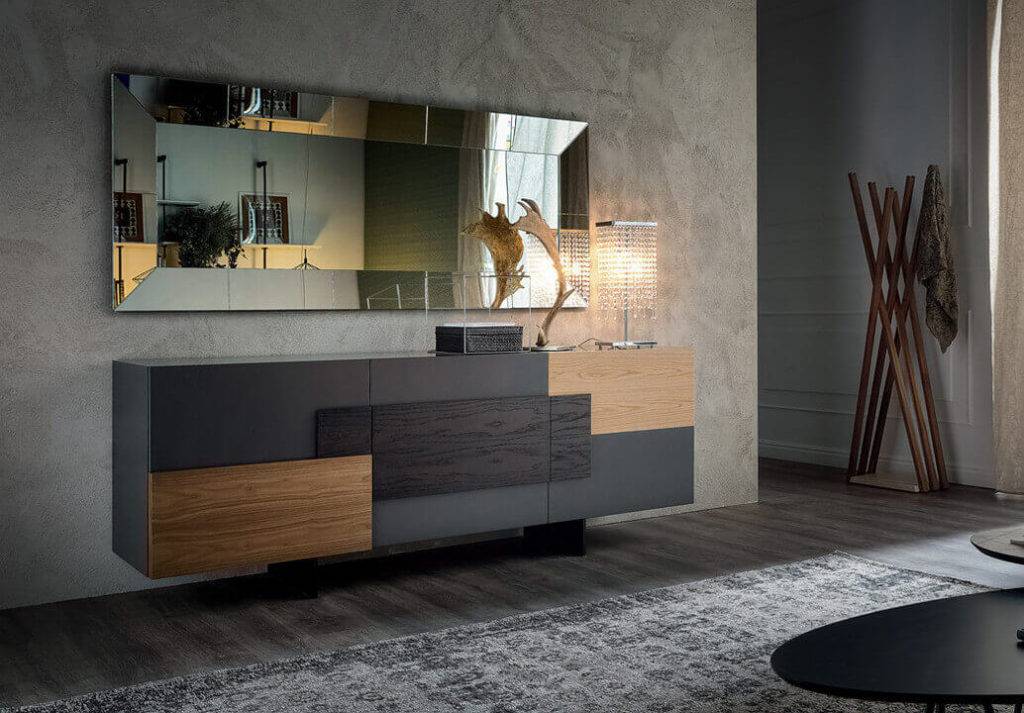 Длинный комод может быть разделен на несколько секций, а его поверхность, украшенная различными безделушками или специальными интерьерными дизайнерскими вещами, может стать отдельным элементом помещения, создающим настроение и служащим своеобразным законодателем стиля и настроения хозяина спальни.