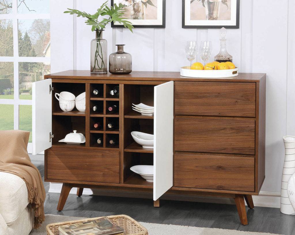 Разновидностью такой мебели, является буфет, тут система хранения делится на две части. Внизу делают ящики. Верхняя часть имеет фасад в виде дверок, реже используются открытые полки. Обычно применяется такое решение для хранения посуды.