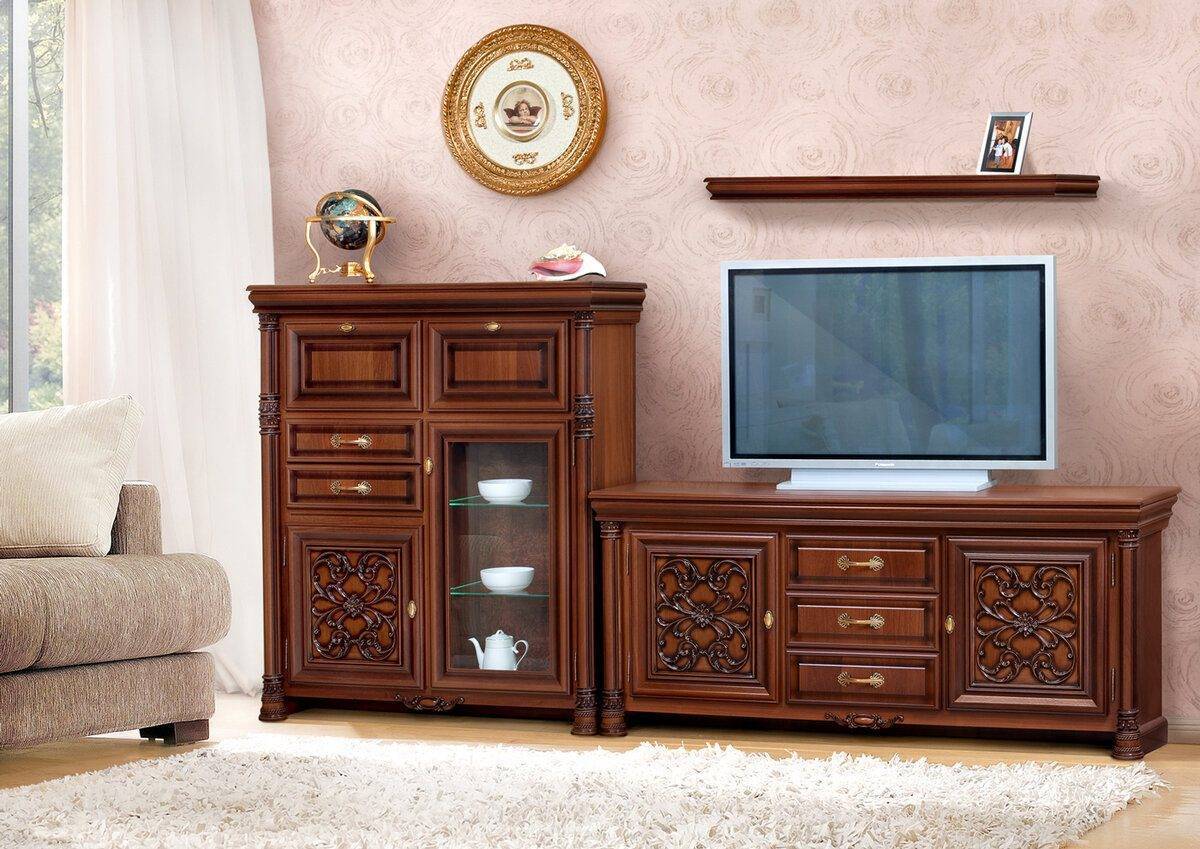 При обустройстве просторной комнаты можно смело выбирать широкую модель. Конструкция органично впишется в классический интерьер помещения. Большие выдвижные ящики способны вместить все необходимые вещи. Столешницу комода актуально использовать под телевизор.