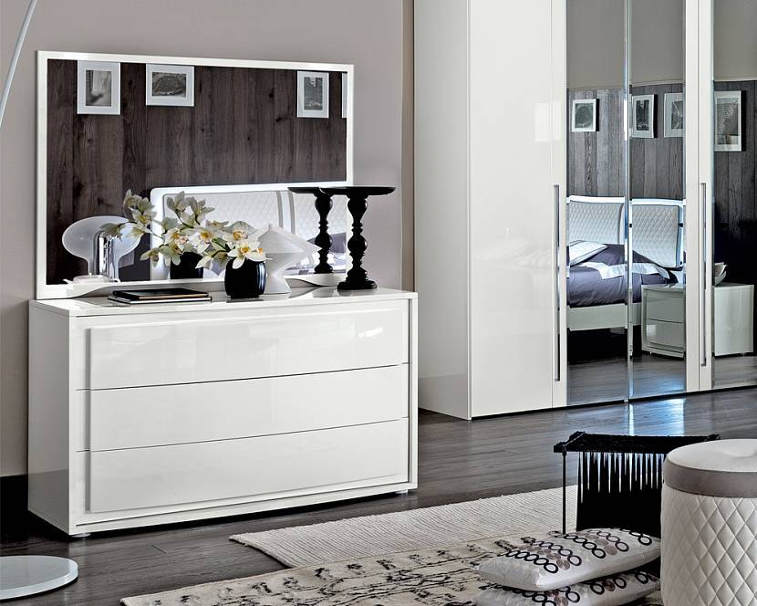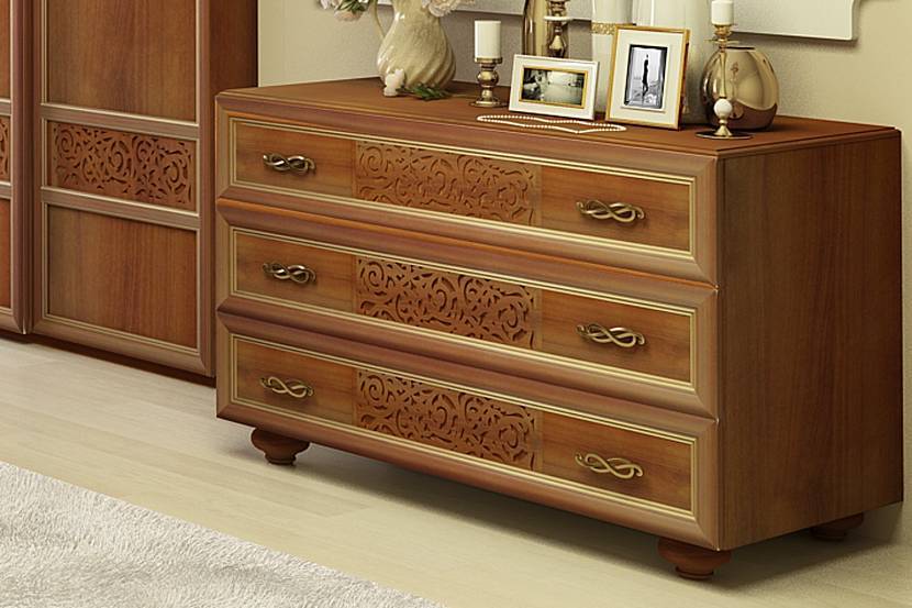 Это хорошая альтернатива туалетному столику, если по какой-то причине вы от последнего решили отказаться. А иногда столик не входит к гарнитур, и комплект, к примеру, «Рондо» включает следующее – кровать, стенка, комод.