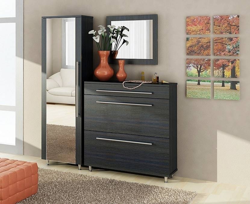 - Габариты изделия также определяет его функциональное назначение. Большая и вместительная конструкция предполагает хранение обуви и достаточного количества вещей. Для мелких предметов и аксессуаров подойдет подвесная модель или комод, имеющий небольшие полки.