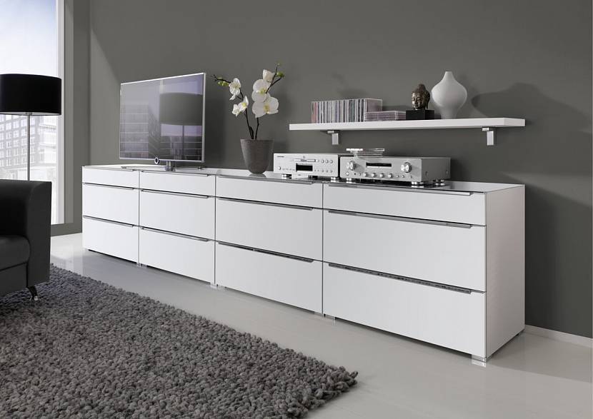 К категории длинных комодов относятся конструкции, у которых длина больше, чем ширина. Стандартные размеры длинных конструкций составляют 120 и 150 см в длину. Предпочтение чаще всего отдают таким моделям в случае, когда верхнюю часть стены нужно оставить свободной. Очень часто столешницу здесь используют в качестве тумбочки под телевизор.