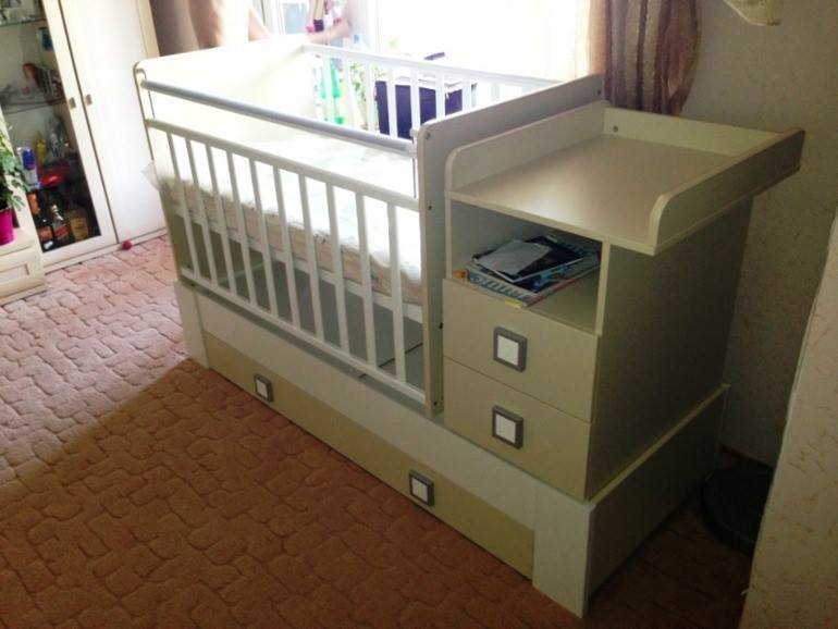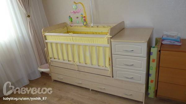 Конечно, эта кроватка требует больше свободного пространства, но с другой стороны — такая мебель обеспечивает комплексный подход в вопросе организации сна и ухода за ребенком.