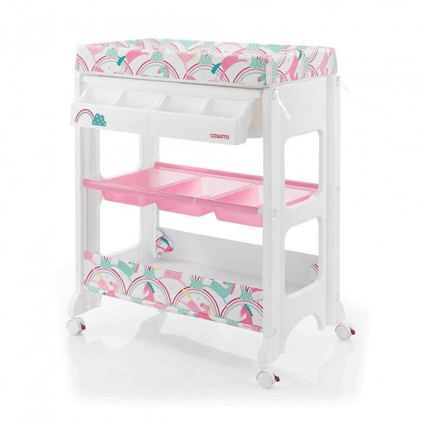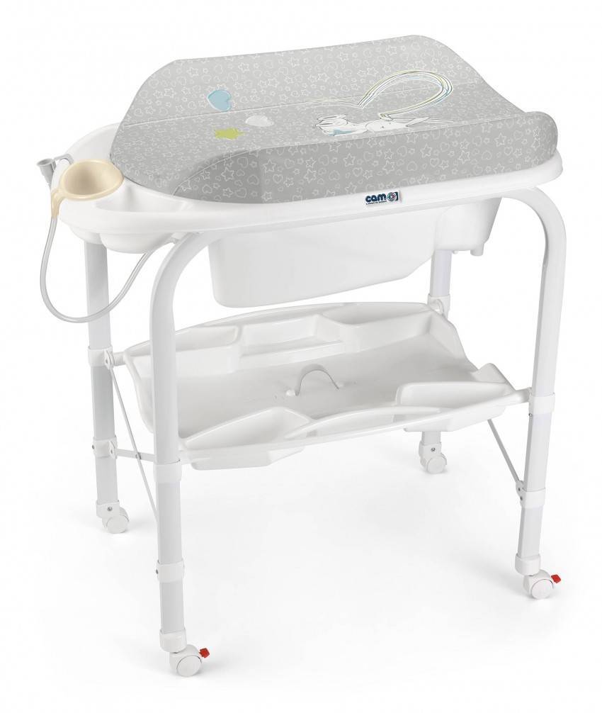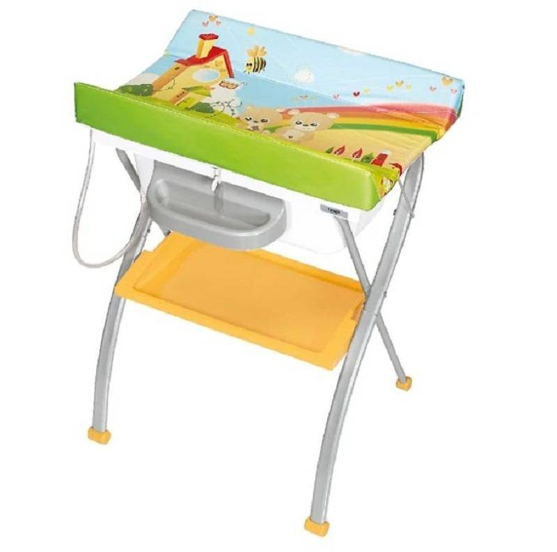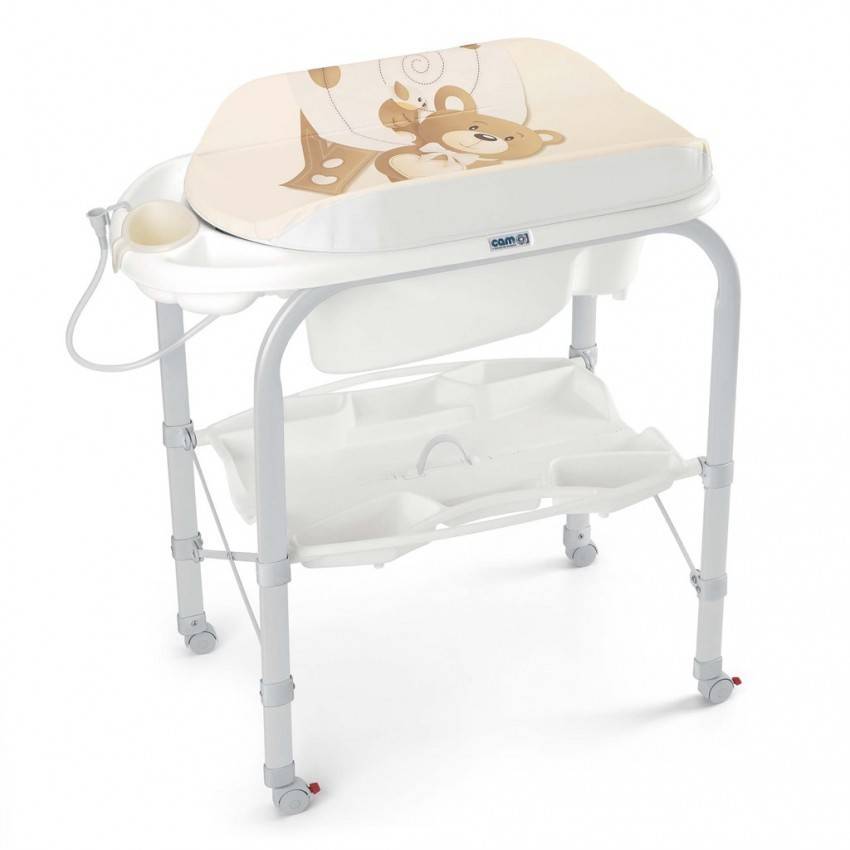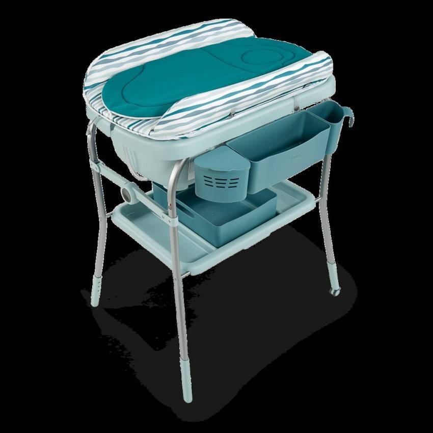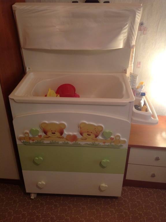 Модель универсальна, имеет разные отсеки, в том числе и из непромокаемых материалов для купания ребенка и хранения предметов гигиены. Ее можно передвигать из детской в ванную, можно использовать как для безопасного купания, так и для пеленания.