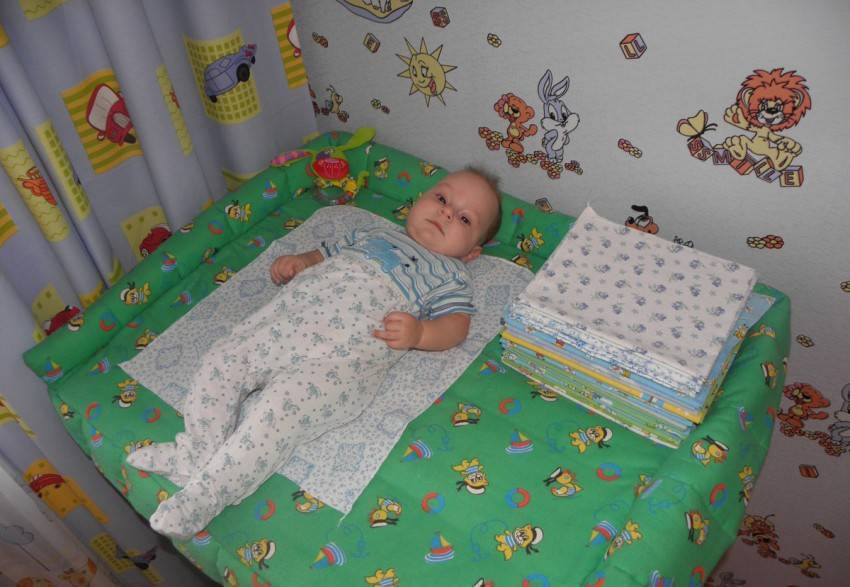 9. На столике, как правило, располагается небольшой матрасик. Полужесткий матрас необходим для того, чтобы ребенок, пытающийся научиться держать головку, не смог себя случайно травмировать.