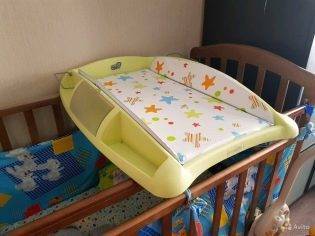 Тип: пеленальная доска. Основа твердая, сверху – водонепроницаемый матрас. С трех сторон – бортики. С фиксаторами на кроватку.