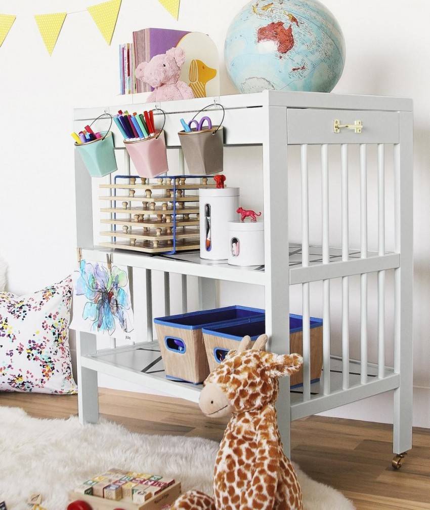 Есть еще более функциональные конструкции с надстройками для размещения большего количества предметов детского гардероба и гигиены.
