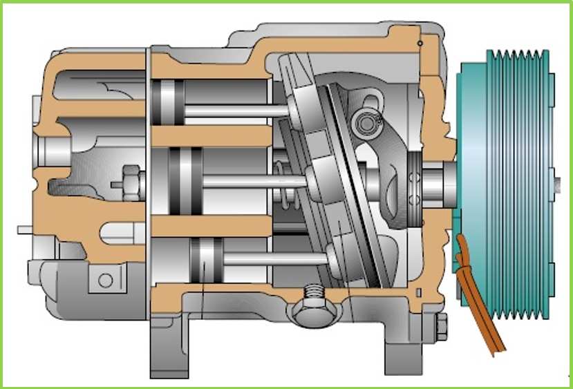 Наклонный диск приводится в движение приводным валом. При вращении диск заставляет поршни двигаться возвратно-поступательно. Движение поршней параллельно валу. Количество поршней варьируется в зависимости от мощности – их может быть 3, 5, 7 или 10. Количеством поршней формируется рабочий такт совместно с открыванием-закрыванием клапанов.