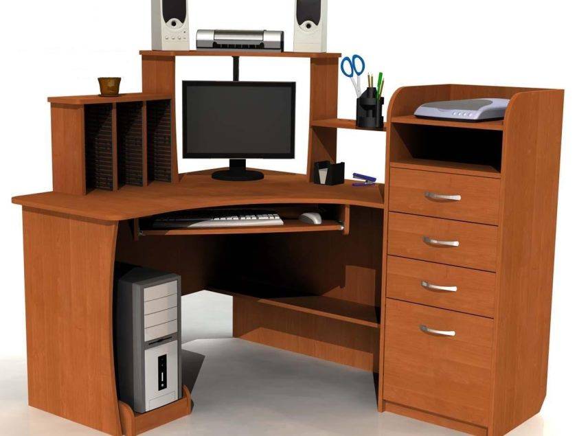 Выбор размера столешницы определяется потребностями пользователя компьютера. При необходимости выполнения письменных заданий приобретайте стол побольше. Учитывайте наличие мест для размещения вспомогательной техники: принтеров, сканеров, колонок, а также проводов.