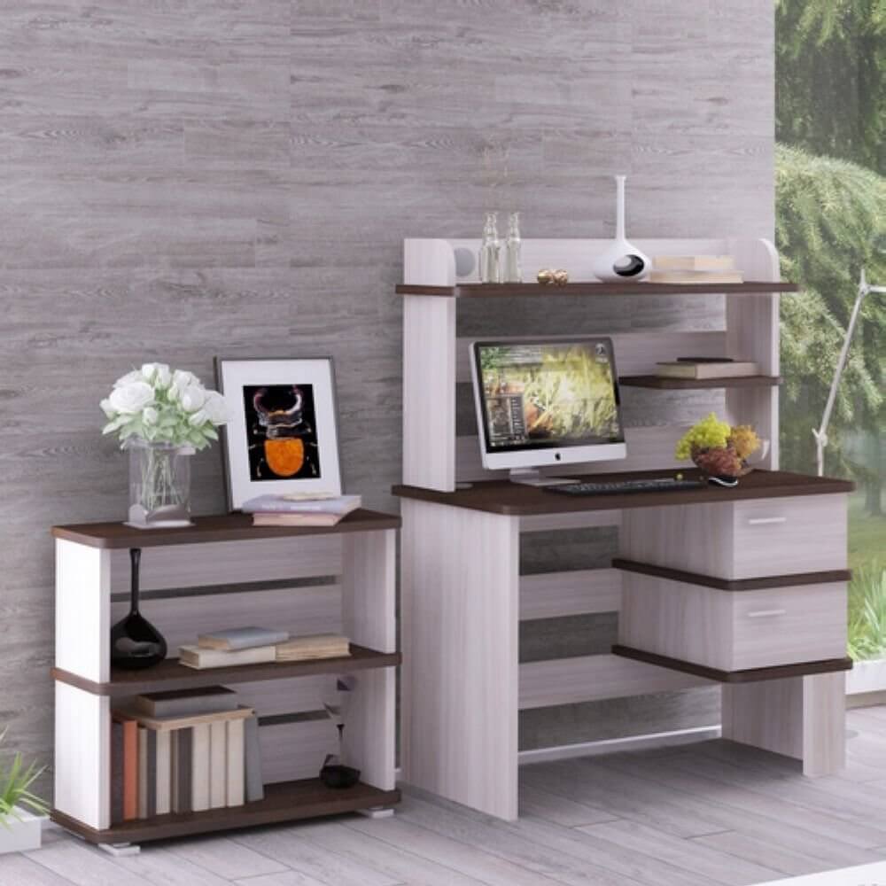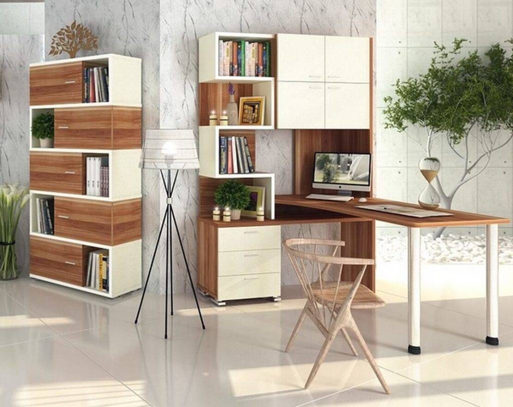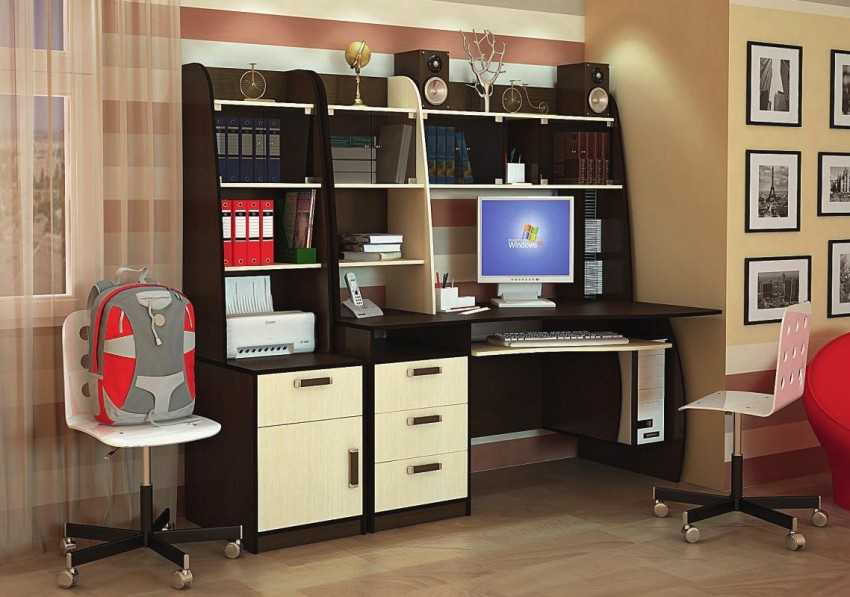 Комбинирование письменного стола с надстроенными полками, шкафчиками, боксами создает своеобразный модульный комплекс, удобный для работы и хранения необходимых принадлежностей. Подобный модуль выполняется в едином стиле и очень компактен. Часто его используют там, где необходимо размещение компьютерной системы в сочетании с рабочим местом.