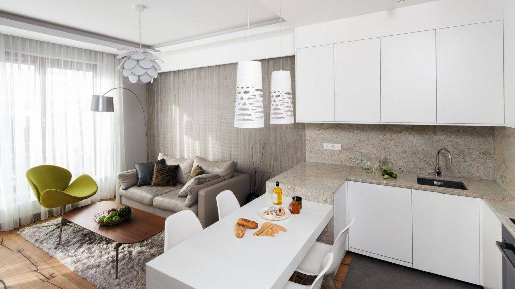 В квартире-студии, в стороне от ТВ можно поставить белый стол на тонких металлических опорах и дополнить его хромированным стулом с серой обивкой. Поставьте напротив этой мебели мягкий уголок в пепельных тонах.