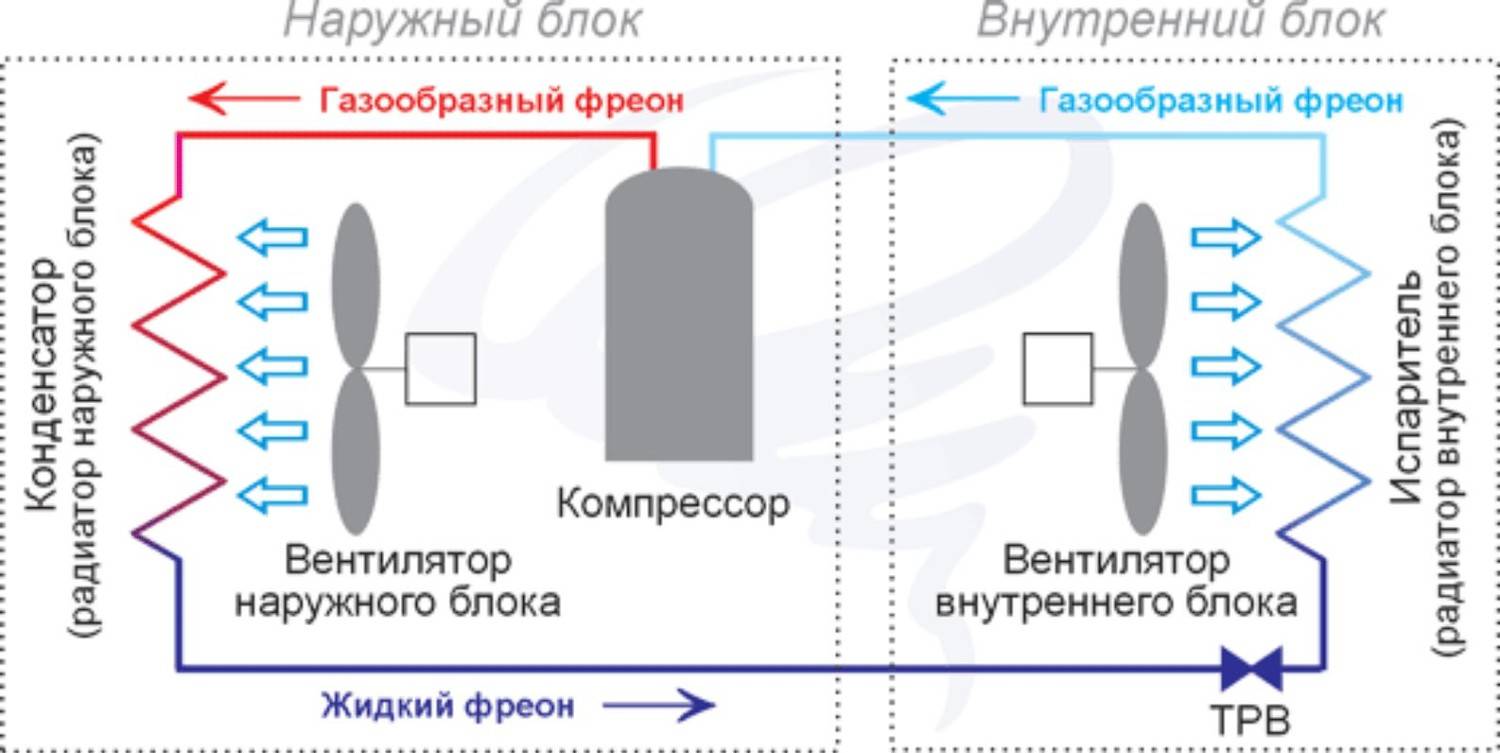 Из помещения забирается большое количество теплоэнергии, чтобы преобразовывать фреон в пар. Внутренний блок, который ставят в помещении, предназначен для испарения фреона. Компрессор перекачивает газообразный фреон во внешний блок, расположенный на улице. Там фреон восстанавливает свою первоначальную форму.