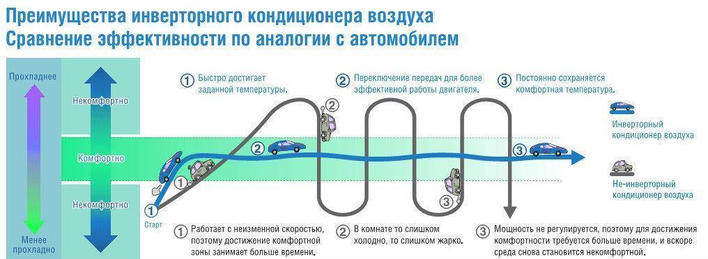 Приборы, оснащённые инвертором, являются хорошей альтернативой традиционным обогревателям, они могут работать при температурных условиях до -16 градусов. Благодаря чёткому и бесперебойному функционированию компрессора на низкой мощности удаётся достичь фактически полного отсутствия сбоев и перегрузок, а также снизить потребление электрической энергии почти на треть.