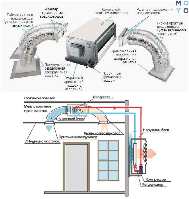 - воздуховоде — он соединяет внутренний блок со внешним;