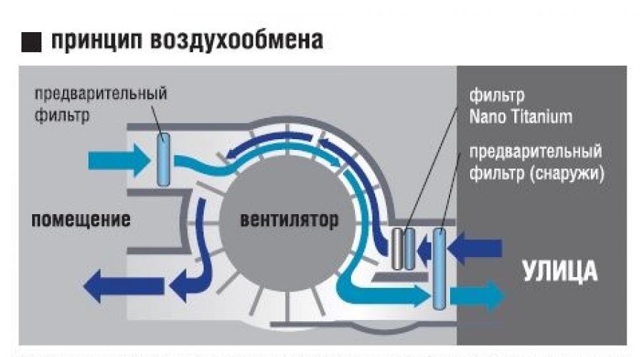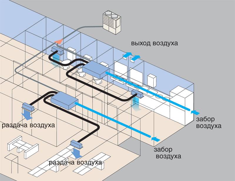 Работа совершается следующим образом. Сначала воздух забирается с улицы, затем по каналу он переходит в смесительную камеру. Во внутреннем блоке воздух фильтруется, подогревается или охлаждается и подается в помещение.