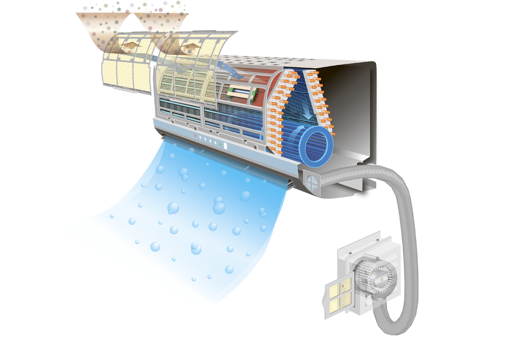 Если говорить о том, каким образом осуществляется работа сплит-системы, то ошибочное мнение заключается в том, что кондиционер забирает воздух с улицы, о чем мы уже сказали выше. Работа кондиционера основана на том, что через внутренний блок он забирает воздух из помещения, очищает его от домашней пыли (через специальные фильтрующие элементы), осушает и возвращает обратно в помещение.