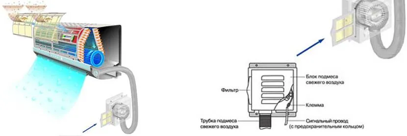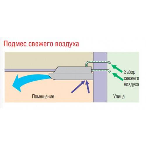 Функция забора воздуха извне включается в системах в режиме охлаждения/нагрева. Воздух через воздуховод попадает на испаритель, смешиваясь с рециркуляционным воздухом, затем охлаждается или нагревается, в зависимости от условий, и после этого проникает в комнату, где смешивается с остальными воздушными массами. В различных системах этот принцип реализован по-разному.