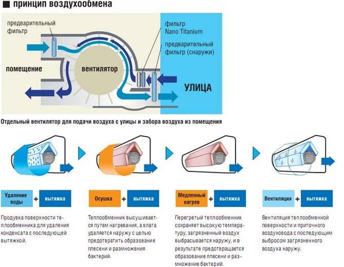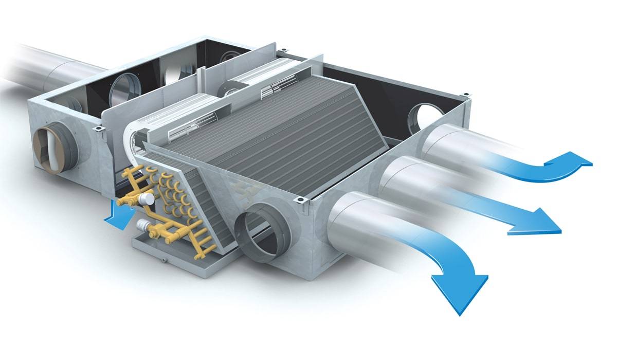 Внутри системы с приточной вентиляцией имеют много общего с устройством обычных бытовых кондиционеров. Внутренний блок оборудован теплообменником, вентилятором и фильтрами. Внешний – компрессором, конденсатором, дросселирующим устройством и системой управления.