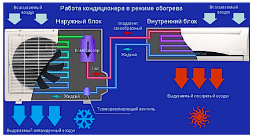 Если нужно охладить помещение, компрессор создаёт разряжение во внутреннем блоке (охлаждая его), а если наоборот нужно нагреть, то во внутренний блок подается давление и он становится горячим.