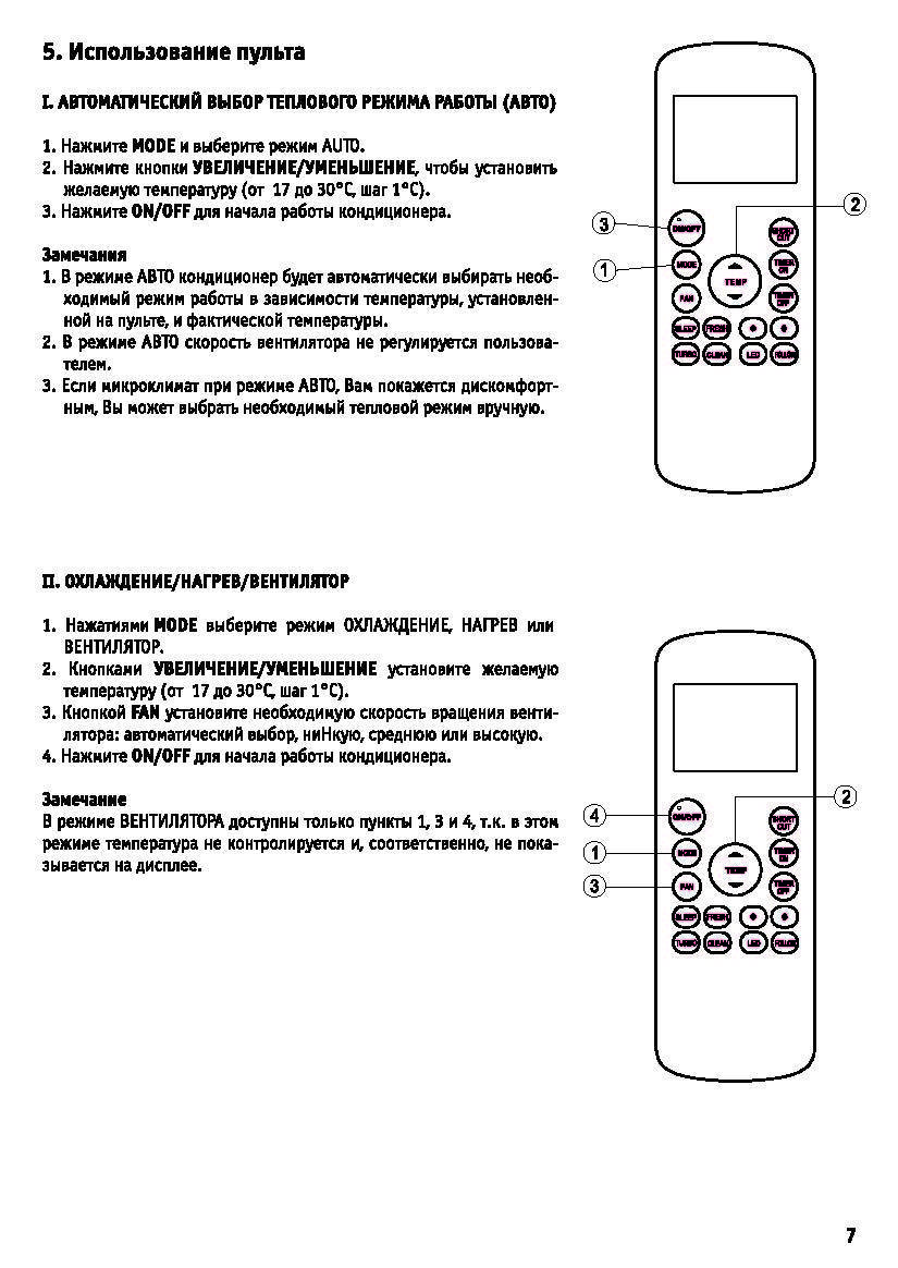 MODE. Отвечает за выбор режима работы. Основные режимы: COOL (охлаждение воздуха), HEAT (нагрев воздуха). Название выбранного режима отображается на дисплее пульта.