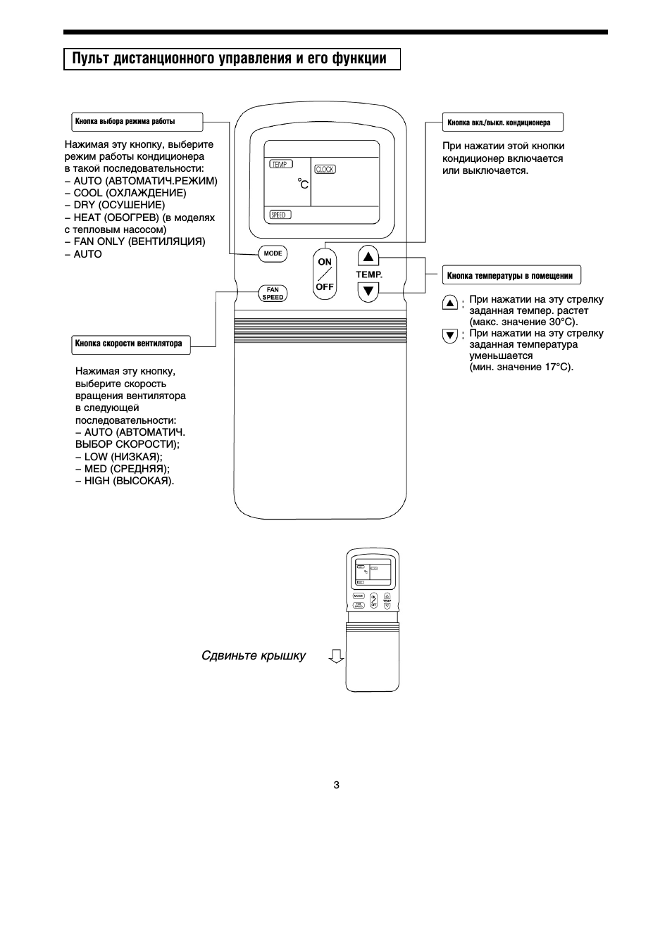 Настройте температуру (кнопки ▲ и ▼ ). Если вы находитесь в режиме вентиляции, настройте скорость, последовательно нажимая на кнопку “FAN SPEED”. При каждом нажатии скорость будет увеличиваться в следующей последовательности: авто → низкая → средняя → высокая.