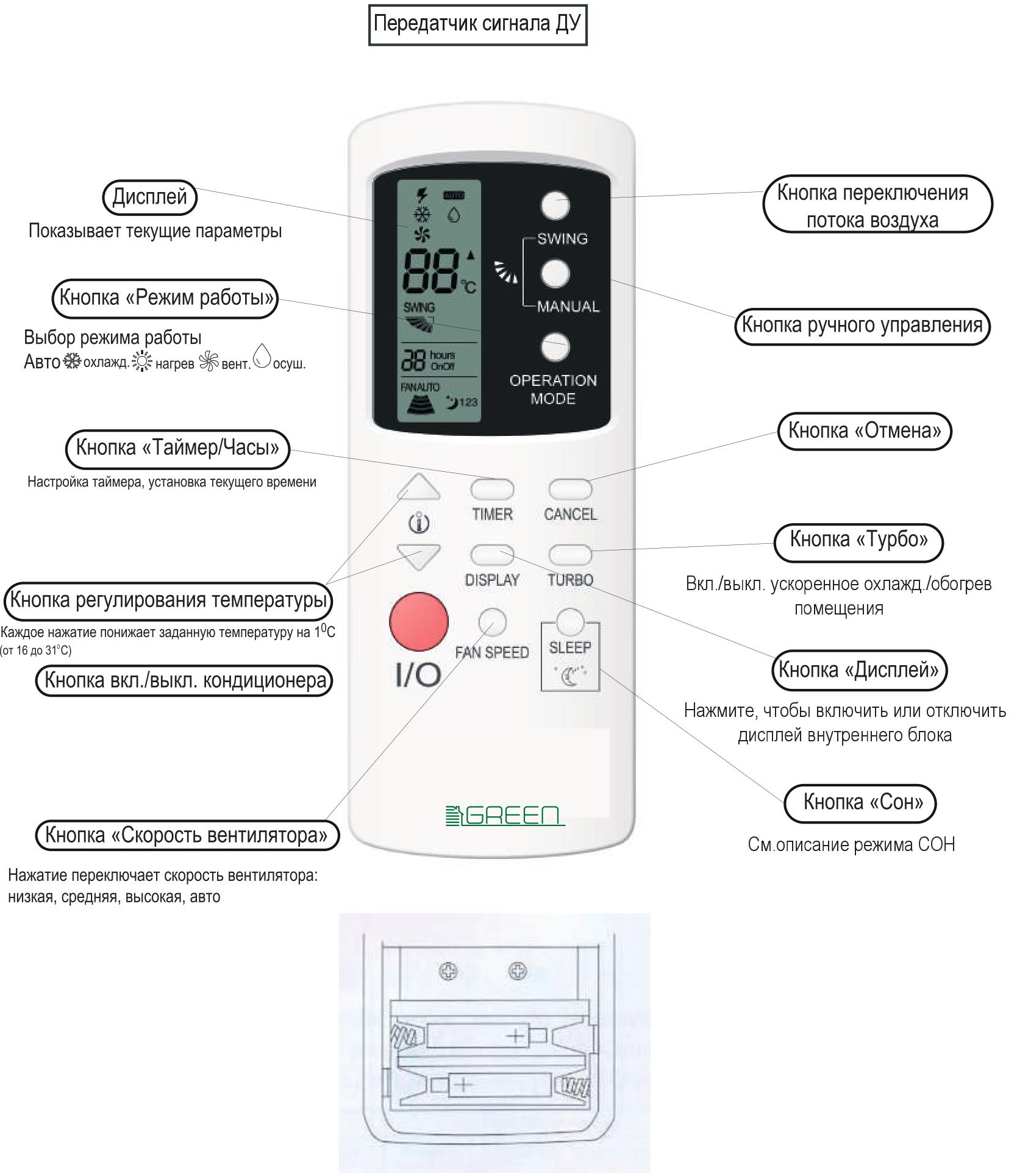 - Кнопка «On/Off» включает и отключает сплит-систему.