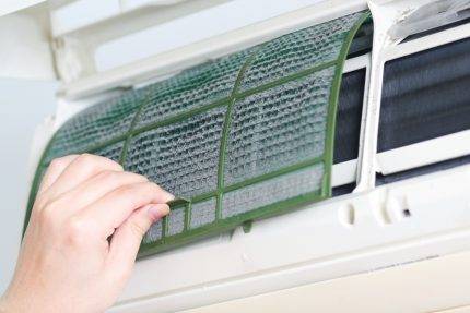Фильтр можно промыть водой или пропылесосить. Обратно его устанавливают после полного высыхания и закрывают крышку блока. Более подробно о том, как проводить профилактическое обслуживание сплита читайте далее.