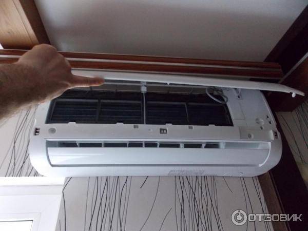 Для чистки воздушного фильтра необходимо снять переднюю панель внутреннего модуля, приподняв ее вверх.