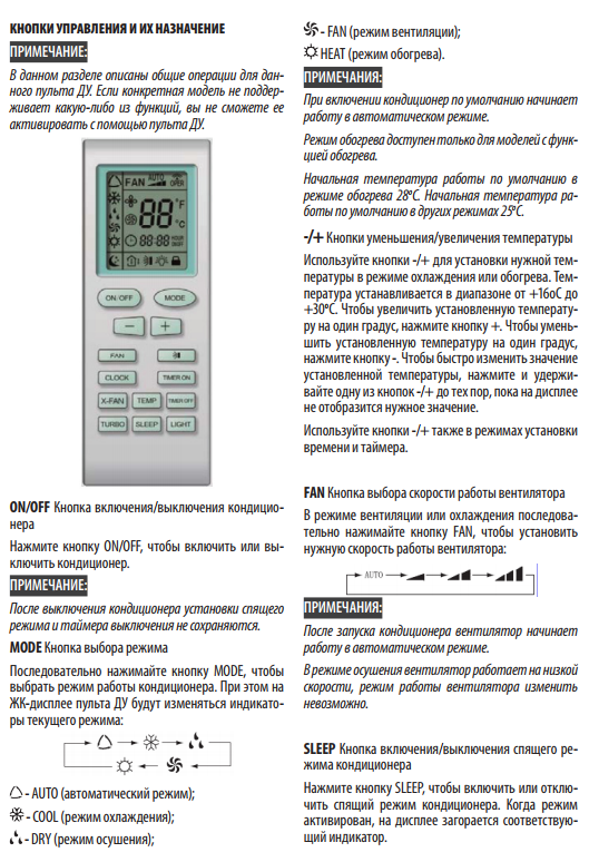 - Наличие 8-и режимов работы: кондиционирование, обогрев, турбо режим, автоматический, осушение, очистка воздуха, вентиляция, ночной.