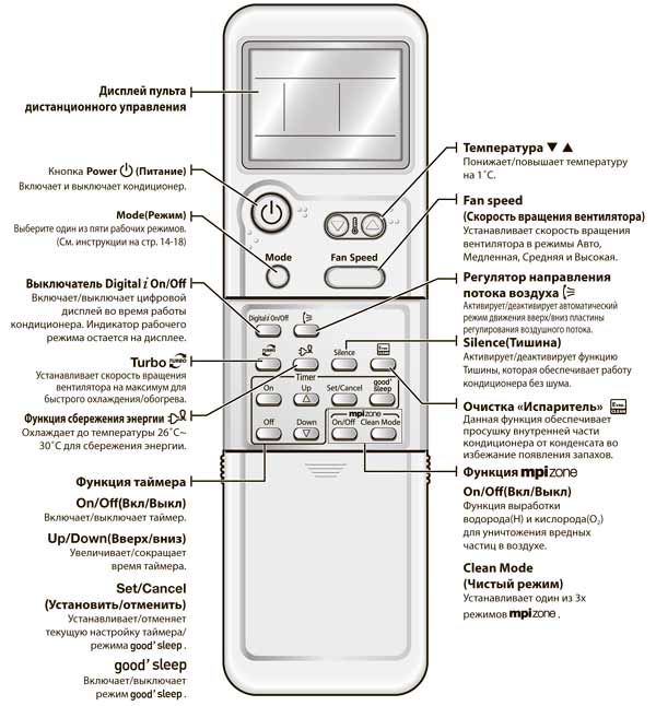 Вся работа кондиционеров сопровождается подсветкой определенных иконок, отвечающих за разный функционал. Основные функции пульта ДУ. Здесь рассматривается назначение каждой кнопки: как включать/выключать кондиционер, переключать режимы, изменять скорость вращения вентилятора, регулировать поток воздуха, устанавливать таймер – все в полных подробностях, в том числе, как сменить батарейки, и за какие режимы отвечают иконки на дисплее пульта ДУ. Рабочие режимы. Подробный мануал по дополнительным режимам кондиционера. Что делает функция FEEL, как включить режим HEAT,DRY,FAN,COOL, и как установить TIMER и режим SLEEP. Техническое обслуживание. Советы и пошаговые инструкции: как почистить забитый воздушный фильтр, правильный уход за лицевой панелью, а также сезонные рекомендации и советы по эксплуатации устройства. Устранение неисправностей. Простые способы диагностики и пошаговое руководство как самому побороть типичные неисправности, где не требуется капитальный ремонт и вмешательства специалистов.