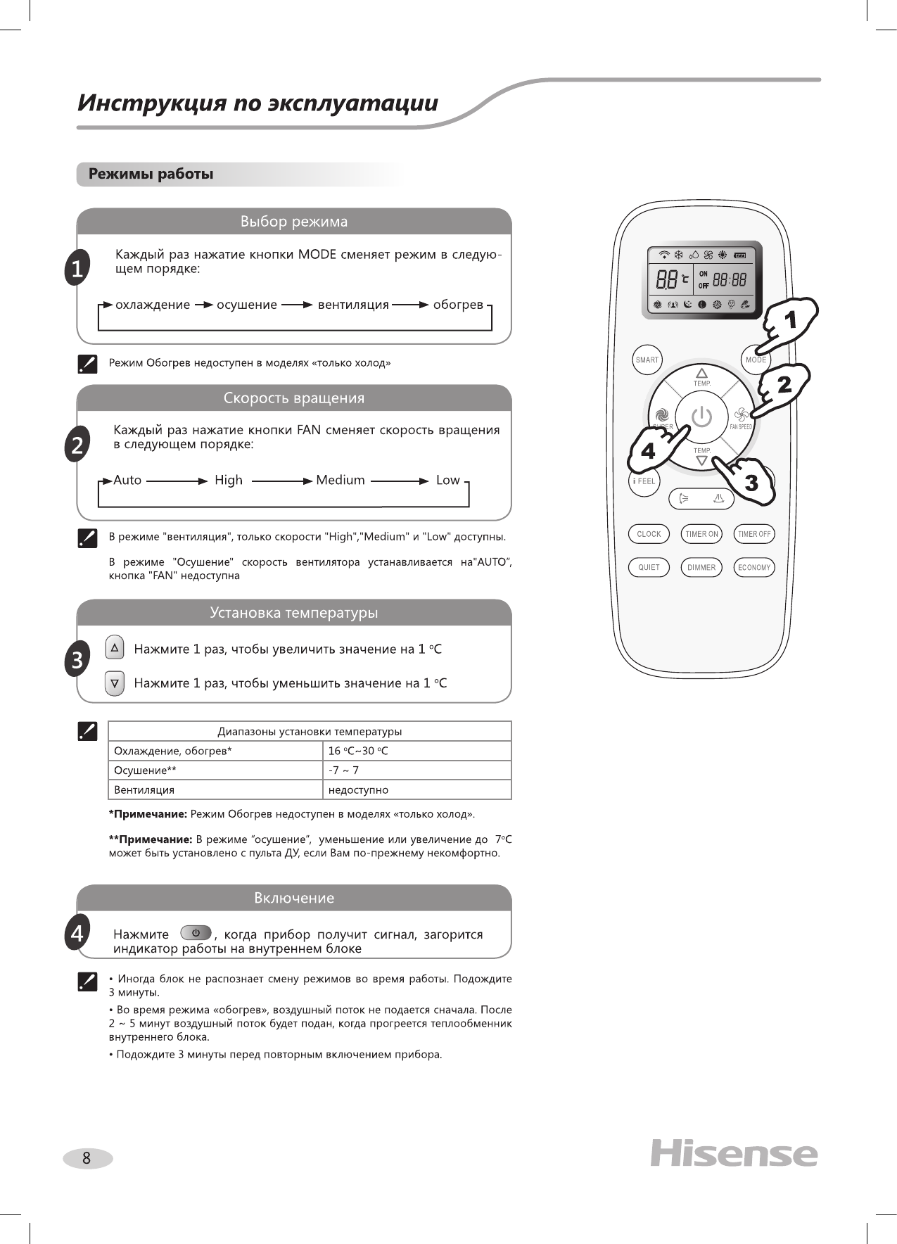 6) В режиме тепла вентилятор внутреннего блока включается не сразу!