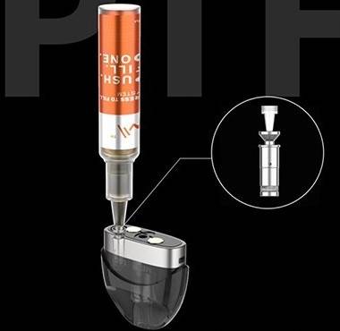Для заправки картриджа удобно пользоваться флакончиком. Его объем составляет 10 мл, то есть, полного флакона хватит на пять заправок. Необходимо снять картридж с батарейного блока, для чего его следует потянуть, преодолевая силу магнитов. Сделать это не так просто, так как специфическая форма мундштука не позволяет надежно ухватить картридж пальцами.