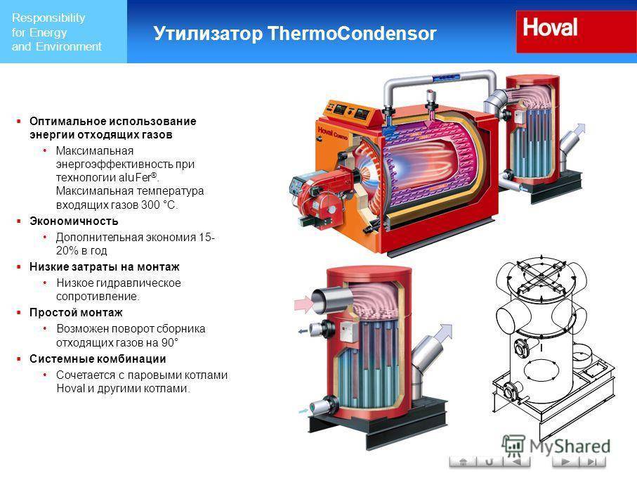 и, как правило, оснащены высокопроизводительнымивентиляторными (дутьевыми) горелками, регулируемыми в широком диапазоне мощности, что дает возможность максимально точно контролировать температуру отходящих газов (не выше 57°С). За работу горелки отвечает автоматика, которая отслеживает все настройки и параметры безопасности оборудования.