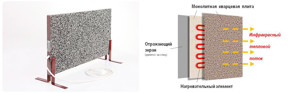 Корпус такого обогревателя сделан из кварца. Учитывая принцип работы, всю конструкцию прибора можно назвать ТЭНом. В качестве нагревательного элемента может применяться любое устройство, которое нагревается в процессе прохождения через него электрического тока. Так, существуют такие кварцевые обогреватели, где в качестве нагревательного элемента используется ИК-излучатель, который с помощью инфракрасных лучей нагревает промежуточную поверхность. Это может быть внешний корпус обогревателя или любая отражающая поверхность, которая нагревает воздух. По этой причине такой обогреватель можно назвать также и инфракрасным, поскольку в основе принципа его работы лежит ИК-излучение.