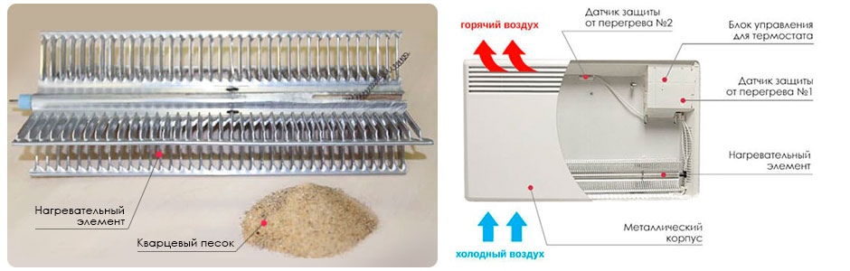монолитный нагревательный элемент. В основе он похож на ТЭН: в литом корпусе из алюминия находится нихромовая нить, а теплоотдачу обеспечивают ребра на корпусе. Но в качестве изолятора тут используется засыпка из диэлектрика. Таким образом, нивелируется разница температурного расширения, ведущая к теплопотерям в ТЭН. В результате эффективность монолитного нагревательного элемента максимальная. Корпус прибора такого конвектора почти не нагревается, а работа происходит тихо. Принцип работы агрегата следующий: полый корпус выполняет роль аэродинамической трубы, по мере нагревания воздуха в ней создается тяга. В результате во включенный конвектор беспрерывно поступает холодный воздух, преобразуется в горячий и поступает вверх, и весь воздух в помещении планомерно прогревается.