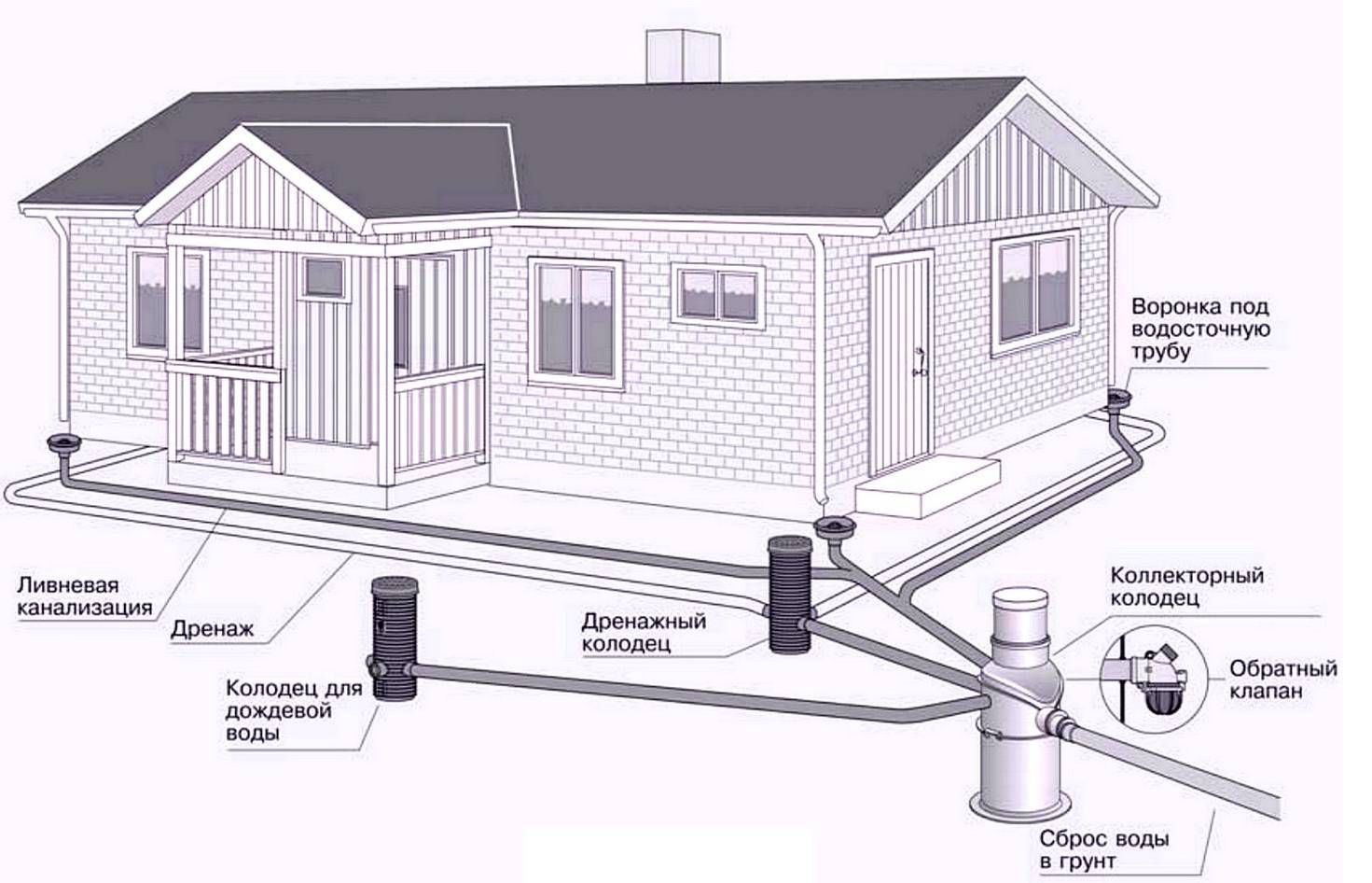 Это упрощенное описание конструкции околодомовой дренажной системы. В реальности дренаж может быть пристенным или кольцевым, все зависит от особенностей грунта и самого частного дома.