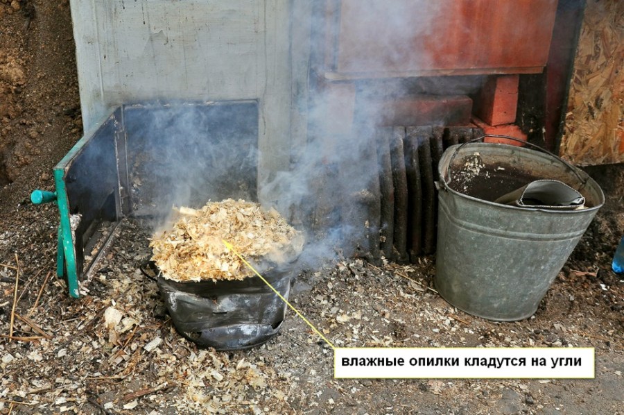 - Чтобы щепа в коптильне не горела, а медленно тлела, её засыпают опилками и листьями.