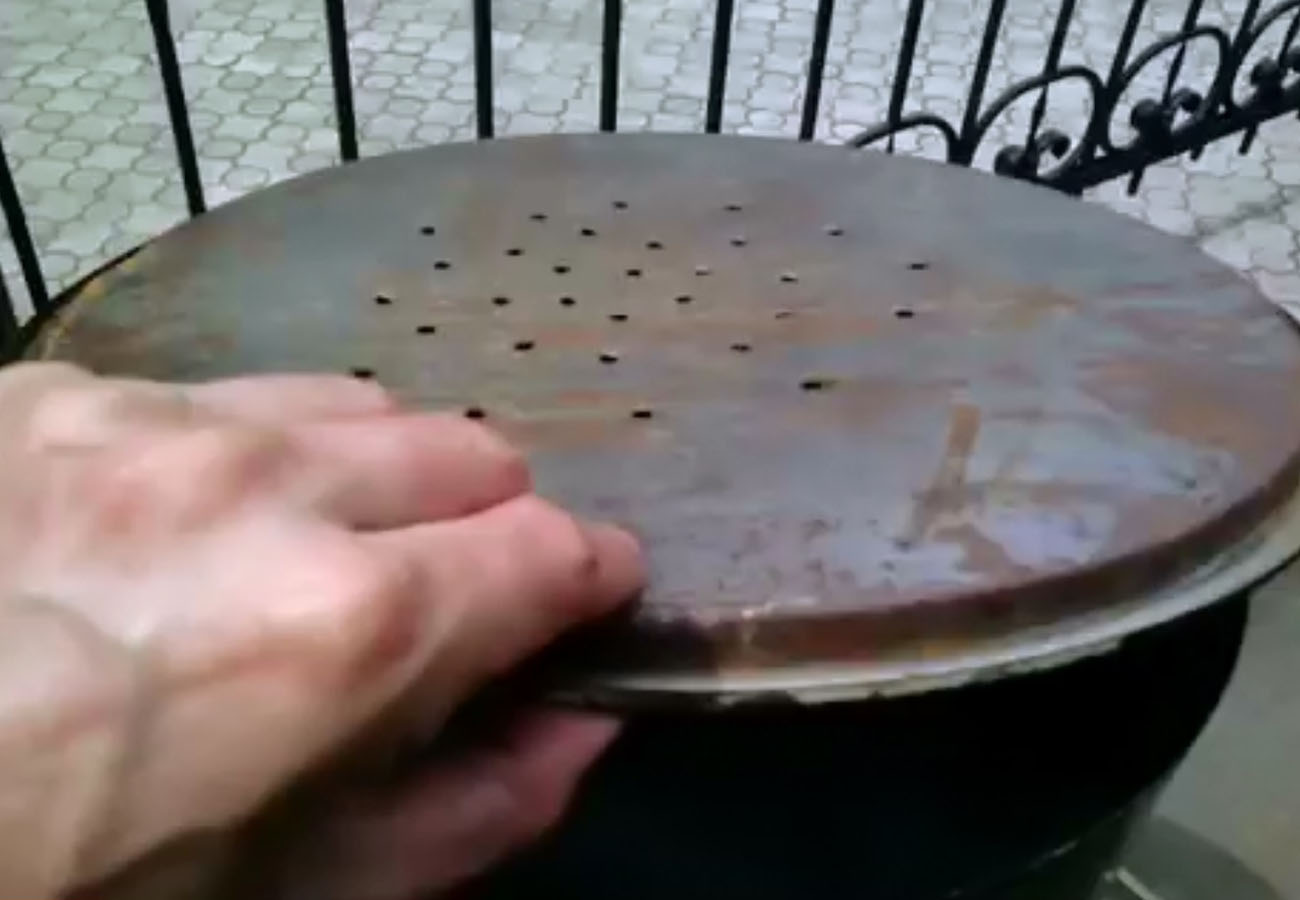 - Если у ведра есть крышка ее тоже задействуют, если нет – стоит позаботится о ее замене. В крышке также проделывают отверстие для высвобождения излишков дыма.