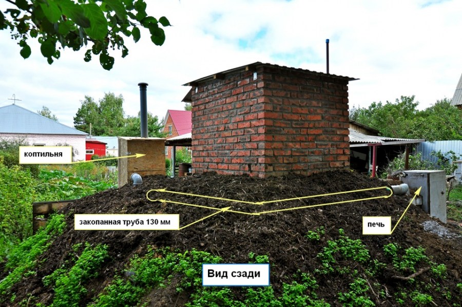 - В качестве трубы-дымохода используется любая подходящая металлическая или огнеупорная пластиковая труба. Это может быть просто траншея, прикрытая сверху металлическими листами или рубероидом и присыпанная землей для герметизации дыма.