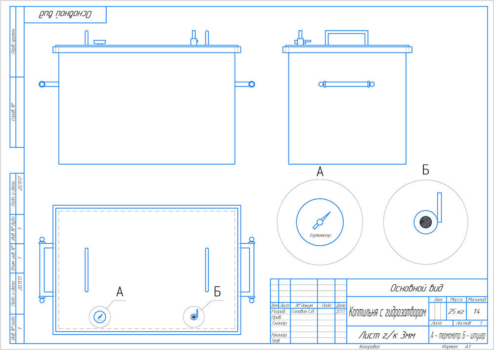 Маленькую коптилку можно брать на охоту, рыбалку или просто на природу. Компактность устройства позволяет легко транспортировать его с места на место. Внутри металлической коробки рекомендуется приварить уголки, на которых можно будет располагать решетку-гриль. При самостоятельном составлении схемы коптильни необходимо учесть все мелкие детали и указать их на рисунке.