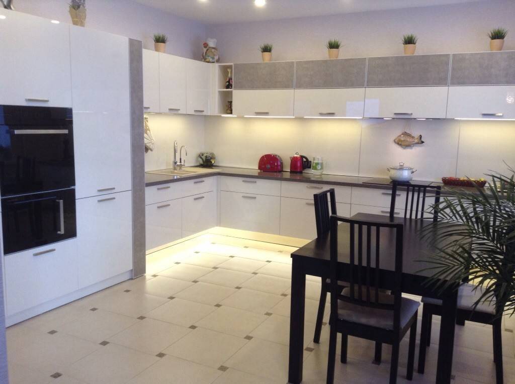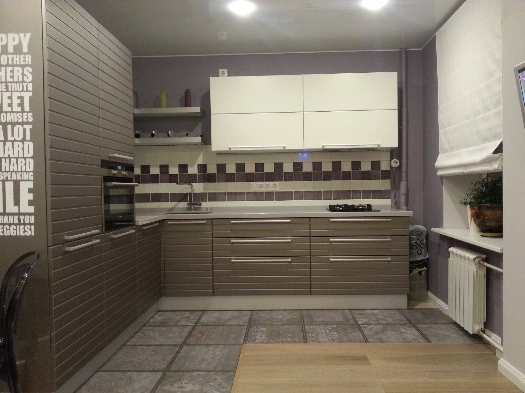 Если ваш гарнитур белого цвета, то можно класть платку практически любого цвета, но все же учитывайте то, что белый цвет относят к холодным. Если белая кухня имеет голубой оттенок, то и пол следует подбирать в похожей гамме. К белой кухне молочного оттенка лучше положить терракотовую или коричневую плитку.