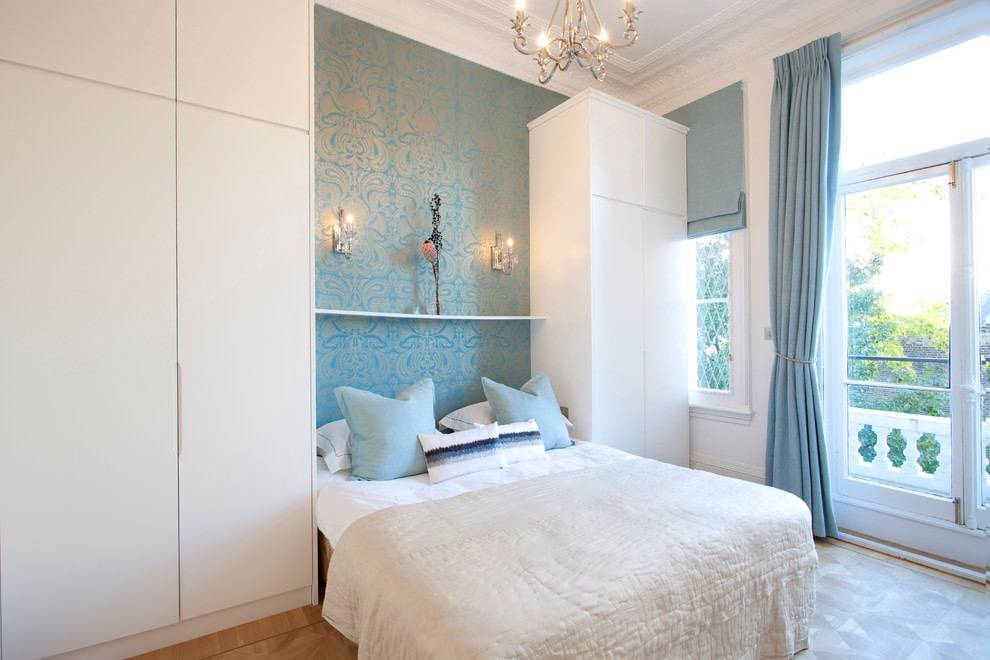 На фото в спальне голубые обои с геометрическим орнаментом белого цвета выступают акцентом стены у изголовья кровати и центральной части потолка, выделяя зону отдыха.