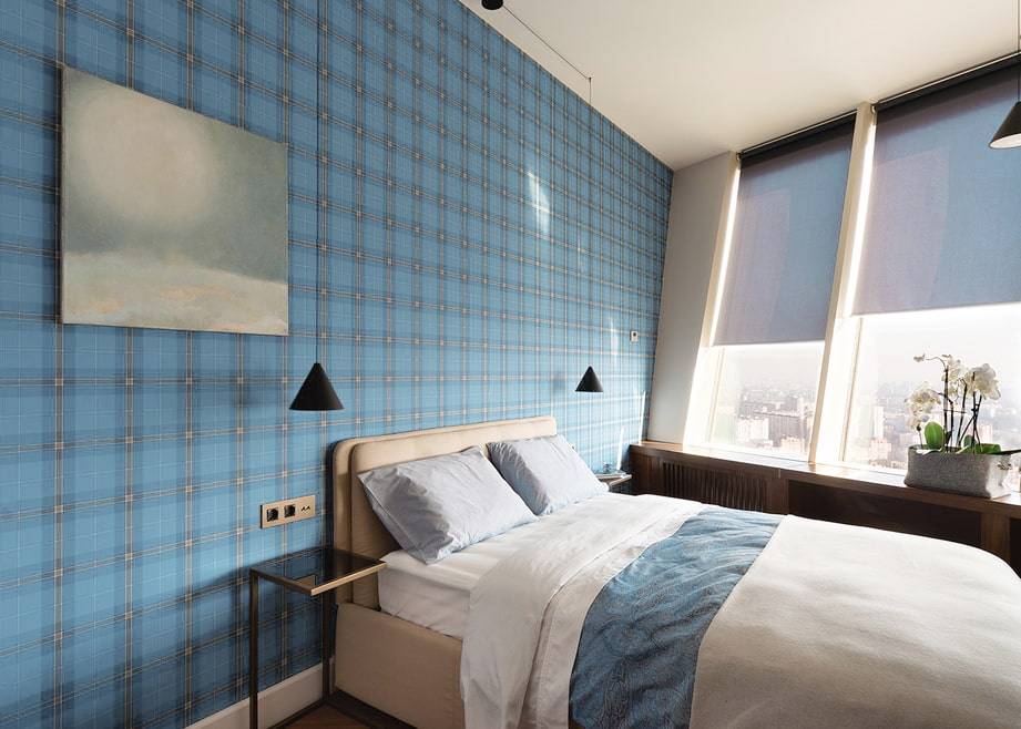 Обоями без узора и рисунка можно оклеить всю комнату или только одну стену. Они сочетаются с белыми или контрастными молдингами. Обои в голубых тонах не выглядят скучно, так как акцент сделан на фактуре (волны, елочка, в крапинку, горошек и т.д.) виниловых или стеклообоев. Нейтральная стилистика подойдет для современного, скандинавского и классического интерьера.