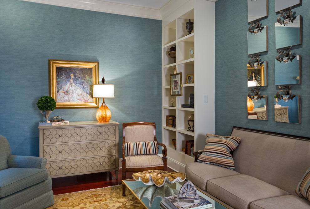 На фото комната в классическом стиле, декорированная стильными грязно-голубыми обоями с текстурой.