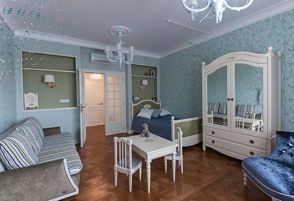 - Для детской комнаты нужно подбирать нежные пастельные цвета. Это может быть нежно-розовый для девочки и голубой для мальчика.