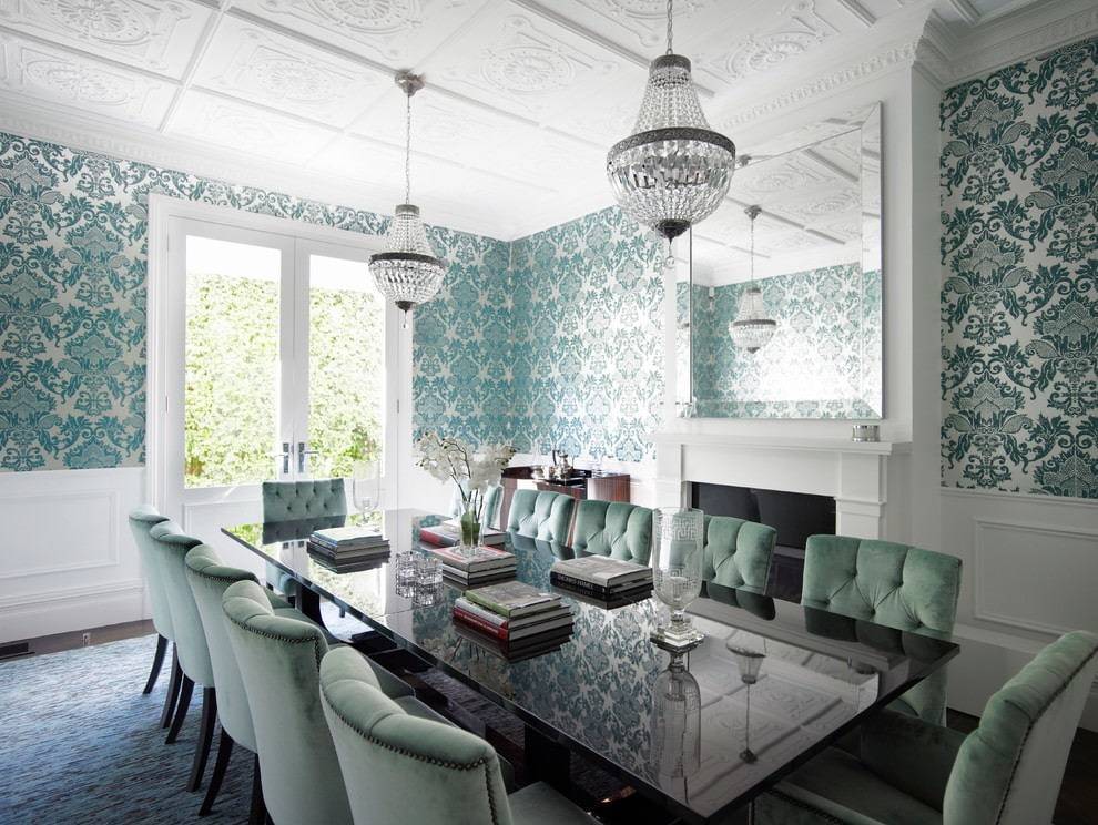 В сочетании со светло-серыми полосками в просторной жаркой комнате обои создадут эффект прохлады, а обои с золотыми узорами и белыми рельефными плинтусами подойдут для комнаты в классическом стиле.