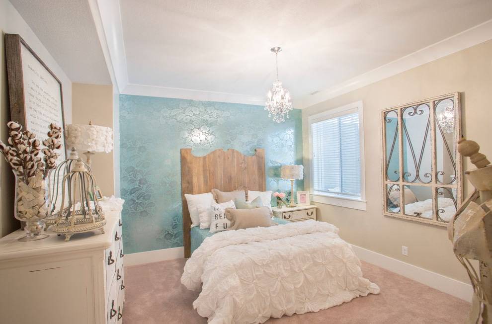 Сочетание бледно-розовой абстракции или цветов на голубом фоне подойдет для стиля прованс. Такой тандем цветов можно разбавить белым текстилем и темно-коричневой мебелью.