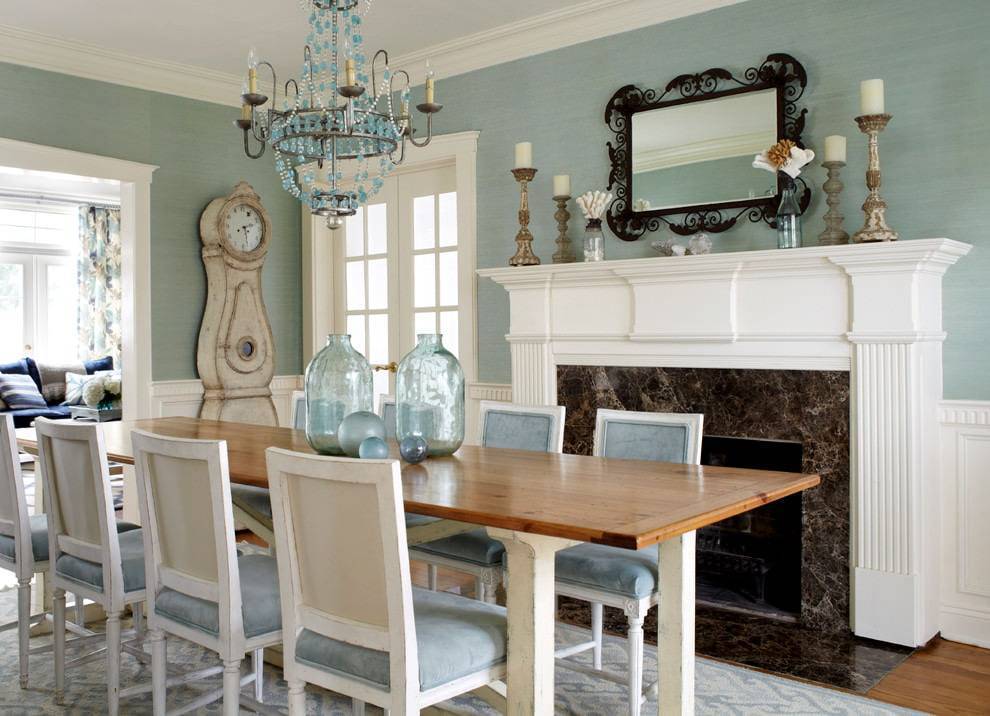 Обои можно комбинировать с одним цветом, который близок к голубому цвету (белый, синий, аквамарин, бирюза, коричневый). В этом случае голубой будет фоном для цвета-компаньона. Также обои можно сочетать с живыми контрастными цветами теплых тонов (оранжевый, желтый, красный) в умеренном количестве. Это могут быть занавески, фурнитура, декор и текстиль.