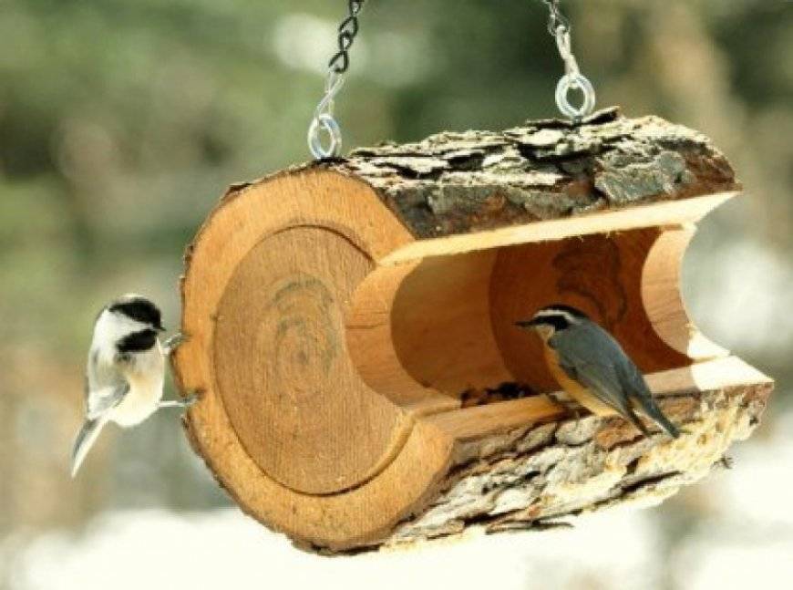 Если же имеется бревно, тогда специальными инструментами удалите из него середину, расположите эту конструкцию на боку и подвесьте. Получится прекрасный домик для птиц, в который вы будете насыпать корм для них.